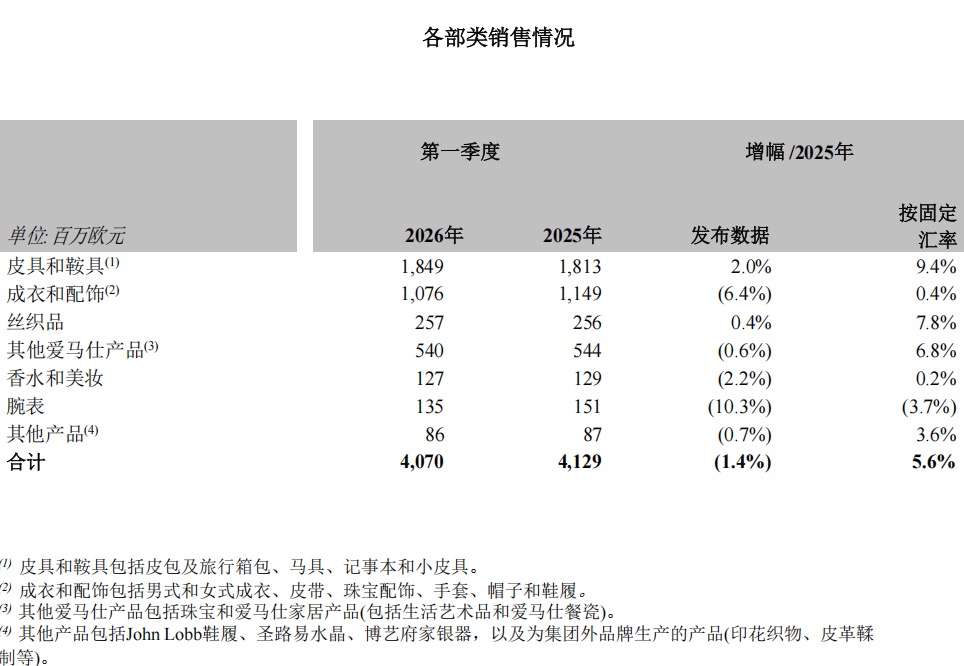 4月15日,爱马仕发布2026年第一季度财务报表,合并营收达40.7亿欧元,按固定汇率计算同比增长5.6%,低于市场预期的7.44%及上年同期的9.8%。